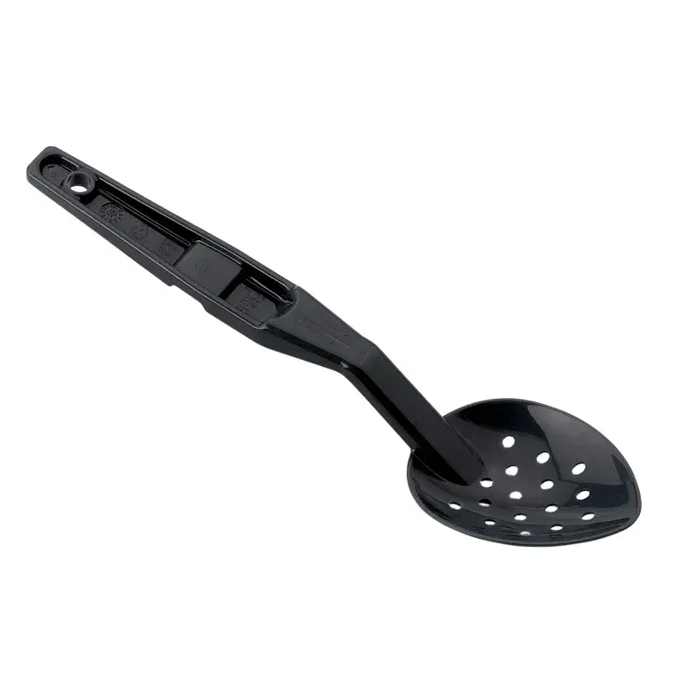 Camwear Serving Spoons are an economical improvement on the metal spoon that won’t tarnish, bend, or dent. Recommended for use with Cambro serving bowls, deli crocks, and storage containers, these virtually unbreakable serving spoons are a great addition to your kitchen. A wide handle and molded-in thumb rest ensure a solid, ergonomic grip, with a notched back to rest on pans. Spoons are perforated to allow liquid to drain out of the bottom during service.