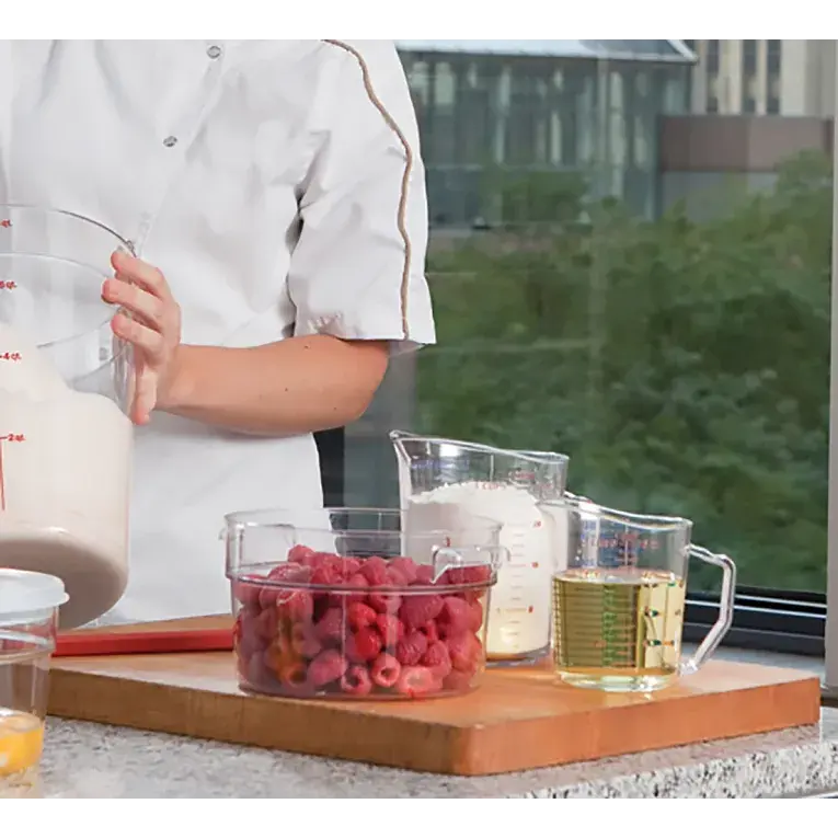 Introduce a new level of accuracy and efficiency to your kitchen with the virtually unbreakable Camwear® Measuring Cups! This crystal-clear design is marked with blue metric and red American standard graduations, saving time and ingredients in the fastest paced environments. Molded in handles are as durable as the cup, ensuring safe carrying.