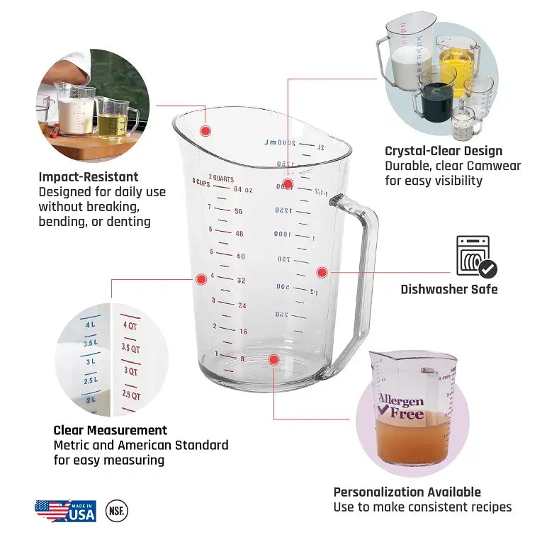Introduce a new level of accuracy and efficiency to your kitchen with the virtually unbreakable Camwear® Measuring Cups! This crystal-clear design is marked with blue metric and red American standard graduations, saving time and ingredients in the fastest paced environments. Molded in handles are as durable as the cup, ensuring safe carrying.