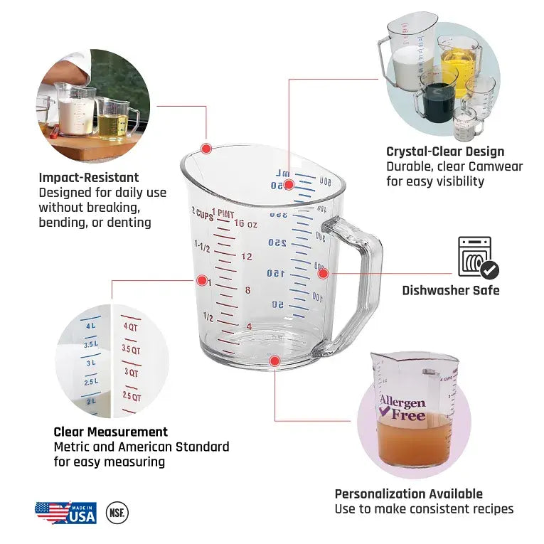 Introduce a new level of accuracy and efficiency to your kitchen with the virtually unbreakable Camwear® Measuring Cups! This crystal-clear design is marked with blue metric and red American standard graduations, saving time and ingredients in the fastest paced environments. Withstands acids, stains, and odors for reliable service, and won’t dent like metal. Personalization is available for additional food safety options. Molded in handles are as durable as the cup, ensuring safe carrying. Camwear® Measuring Cups are the industry leading way to reduce risk of contamination, enhancing food safety and ease in the kitchen!